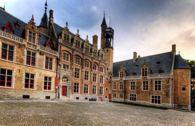 Ратуша розташована на центральній площі Бург. Будівлю було зведено наприкінці XIII - на початку XIV століття у стилі фламандської готики. Архітектурні риси споруди повторюються у ратушах інших бельгійських міст: Левена, Гента, Брюсселя. Сама площа Бург – це старовинний центр Брюгге, де перший фламандський граф збудував свій укріплений замок. Площа оточена історичними спорудами різних епох та архітектурних стилів.
