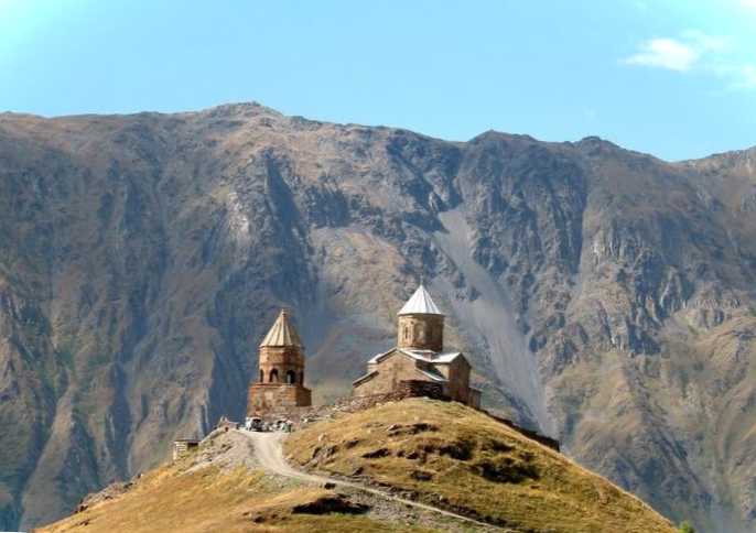 Високогірний храм XIV в., розташований на висоті понад 2 км. над рівнем моря. Стародавні стіни храму стоять на тлі блискучих льодовиків Казбеку. Він ґрунтувався на місці язичницького храму, на думку деяких путівників у стінах, давній срібний ідол у вигляді оперативної пам’яті все ще зберігається, не зруйнований місцевим духовенством. З Військово-Грузинської дороги на церкву відкривається мальовничий краєвид.
