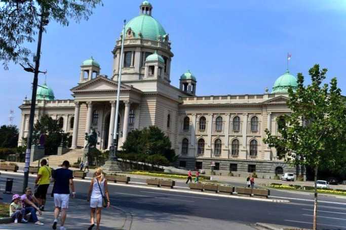 Монументальний палац у класичному стилі було зведено у 1936 році за проектом Й. Ілкіча та К. Йовановича. На завершальному етапі будівництва в 1934 до роботи над інтер'єром підключився головний архітектор Ялти Н. П. Краснов. Довгий час у будівлі засідав уряд Югославії, з 2006 року його обійняв Парламент Сербії. Споруда має важливе історичне та культурне значення та вважається цінною пам'яткою.
