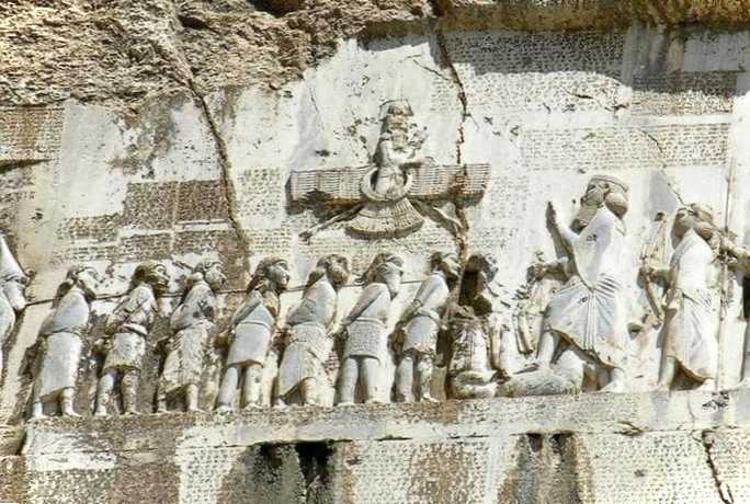 Зображення з клинописом, характерним для часів Дворіччя, висічене на скелі Бехистун. Напис був створений за наказом царя I в VI ст. до н.е. Вона зображує тріумф володаря над бунтівними князями. Письмена нанесені трьома мовами: аккадською, давньоперсидською та еламською.