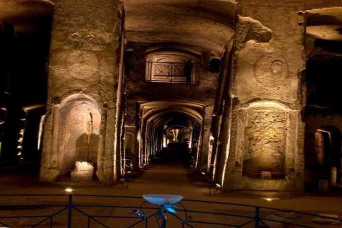 Комплекс підземних лабіринтів, який почав формуватися з II ст.е. Тут ховалися від переслідувань перші християни. У катакомбах послідовники Ісуса ховали покійних, проводили богослужіння, організовували підземні храми. На стінах збереглися стародавні розписи та мозаїки. На одному з верхніх рівнів знаходиться могила неаполітанського покровителя та захисника Св. Януарія.