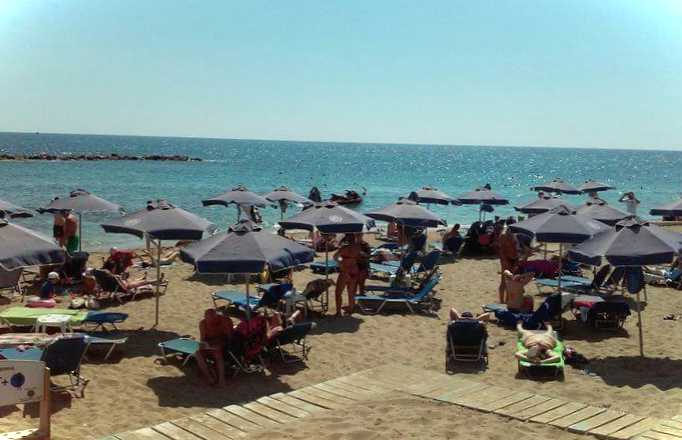 Зона для купання розташована в центрі туристичної частини міста неподалік Пафоського замку. Пляж простягся на 150 метрів уздовж узбережжя. Він оточений численними барами та тавернами, а також обладнаний усіма необхідними елементами інфраструктури. На пляжі можна орендувати катамарани, гідроцикли, "банани" та інші водні види транспорту.