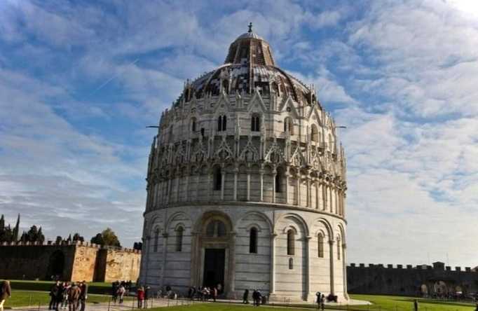 Чудова готична споруда XII-XIV ст., зведена за проектом архітектора Діотісальві. Баптистерій вважається найбільшим в Італії. У висоту будівля сягає 55 метрів, діаметр кільця стін – 34 метри. За первісним проектом спорудження планувалося звести в романському стилі, але тривалість будівельних робіт майже в 200 років дозволила додати в вигляд більш витончені риси готичної манери.