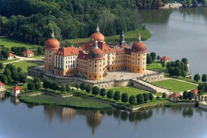 Величний замок у місті Моріцбург (14 км. від Дрездена), одна з резиденцій королівської династії Веттінів. У середині XVI століття на місці замку знаходився мисливський маєток. За Серпня Сильного було проведено масштабну реконструкцію самої будівлі та перепланування навколишнього ландшафту. Результатом цього стала мальовничий "палац на воді" у стилі саксонського бароко.