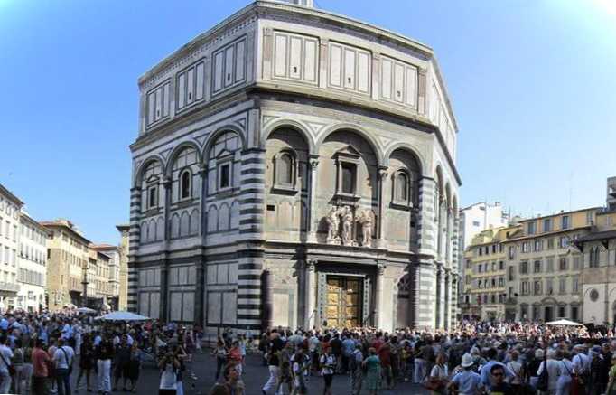 Восьмикутний мармуровий будинок XI-XII століття, що призначався для хрещення. Тут приймали християнську віру представники могутнього сімейства Медічі та великий Данте. Будова прикрашена барельєфами, над якими працювали візантійські майстри. Найбільшу увагу туристів привертають східні ворота баптистерію, де на позолочених панелях зображені сцени з Біблії.