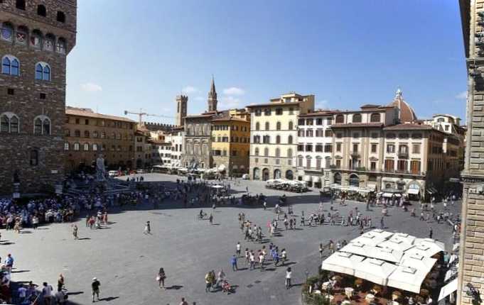 Історичний центр та одна з найкрасивіших площ у всій Італії. Площа являє собою гармонійний архітектурний ансамбль, до якого входять Палаццо Веккьо, Фонтан Нептуна, Лоджія Ланці та кілька скульптурних груп. Ще в давнину тут знаходилося перехрестя важливих доріг, стояв римський амфітеатр та античні вілли. Але до наших днів ці споруди не збереглися.