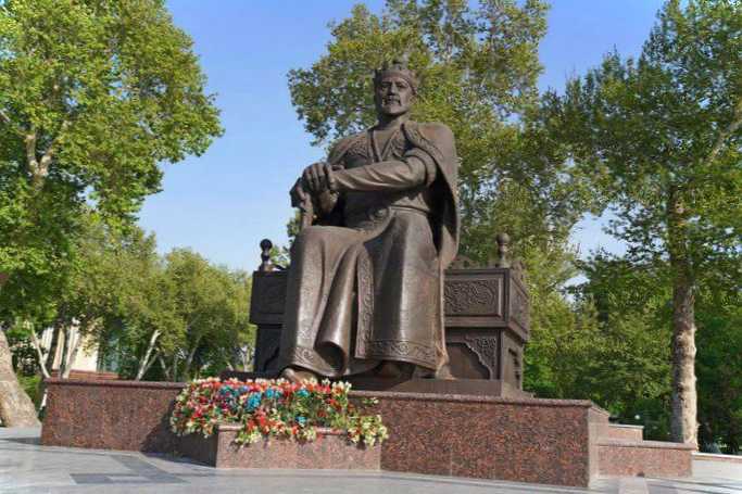 Величний монумент встановлений на університетському бульварі. Амір Темур зображений тим, хто сидить на лаві і обома руками спирається на меч. Його обличчя виражає незворушність. Цю територію освоїли ще позаминулому столітті. Алея із високих насаджень ділить проспект на дві частини. У сучасний період тут з'явилися фонтани з підсвічуванням. Поруч були збудовані перші у місті будівлі в європейському стилі.