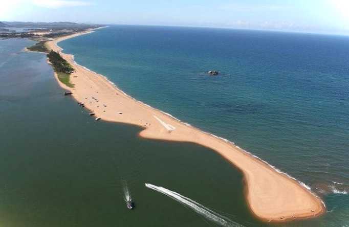 Вузька смуга піску завширшки кілька десятків метрів, що відокремлює прісні води річок Ваньцуаньхе, Лунгун і Цзюцюй від солоних хвиль Південно-Китайського моря. Це унікальне природне місце занесено до Книги рекордів Гіннеса. Пляж розташований поблизу невеликого містечка Боао, яке знаходиться на східному узбережжі острова. "Нефритовий пояс" вистелений білосніжним сяючим піском.