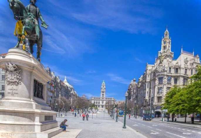 Центральна площа Порту, оточена чарівними особняками та адміністративними будинками XIX-XX ст. у стилі модерн. Зовнішній вигляд площі та найближчих кварталів разюче відрізняється від хаотичної забудови старої частини міста, оскільки всі споруди зводилися згідно з єдиним архітектурним планом. Посередині встановлено пам'ятник королю Педру IV, створений у середині XIX століття.
