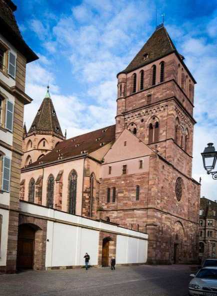 Найбільша лютеранська церква Страсбурга, збудована на місці ранньохристиянської каплиці VI ст. До XVI століття церква Святого Хоми належала католицькій парафії, проте завдяки старанням місцевого священика М. Бюсер храм став протестантським. Фасад будівлі виконаний у суворому романському стилі з елементами готики, проте внутрішні інтер'єри відрізняються пишністю та різноманітністю.