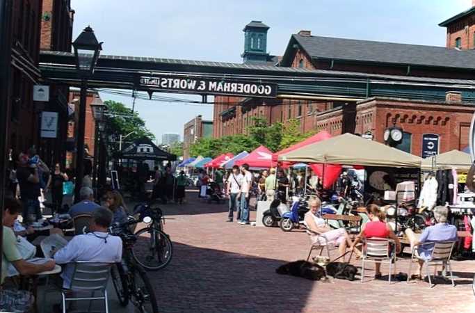 Модний район у центрі міста, де раніше розташовувалися виноробні та пивоварні заводи. Зараз у колишніх промислових корпусах архітектури вікторіанської епохи відкрито сучасні картинні галереї, працюють ресторани та проводяться концерти. Дистилери Дистрикт вважається престижним та фешенебельним районом, тут із задоволенням проводять час місцеві жителі та туристи.