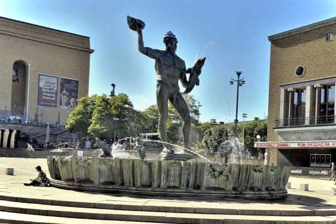 Один із символів Гетеборга. Висота статуї – 7 метрів. Творець фонтану Карл Міллес закінчив роботу над ним до 1930 року. Посейдон виглядає, як атлетичний юнак, що тримає в руках раковину та рибу. Чаша фонтану прикрашена додатковими елементами декору - фантастичними істотами та водоплавними. Все це створює ефект динаміки та робить композицію більш живою.
