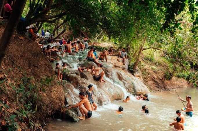 Розташовані серед густих джунглів, за кілька кілометрів від кольорових озер. Вода з мінерального джерела стікає по камінню кількома водоспадами в природні ванни, призначені для купання. Температура води в них - 40-45 ° С, рекомендований час знаходження - не більше 20 хвилин. Далі вода потрапляє в прохолодну річку Тхом, куди приємно поринути після гарячих водних процедур. Поруч на березі обладнані місця для відпочинку та масажу.