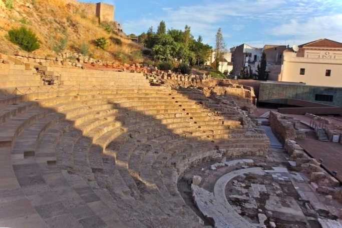 Театр розташований біля підніжжя пагорба, на якому височіє Фортеця Малага. Вважається, що споруда була збудована останніми роками правління імператора Августа в I столітті. Театр використовувався за призначенням до ІІІ ст. Потім до Малаги прийшли араби. Вони частково розібрали сцену та використали каміння для зведення оборонних споруд. Римський театр був випадково виявлений у середині XX століття, розкопки були завершені лише у 90-ті рр.