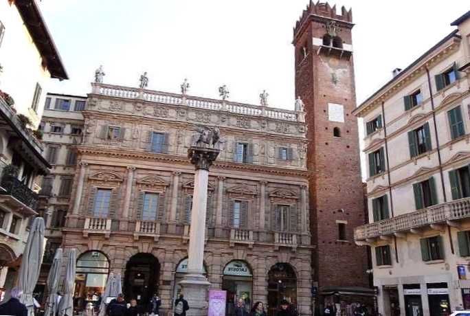 Палац XV-XVII століть, справжній шедевр італійської барокової архітектури. Фасад прикрашений статуями римських богів, елегантними балконами, арками та напівколонами. До будівлі примикає строга цегляна вежа дель Гарделло з годинниковим циферблатом XV ст. Навпроти палацу встановлено колону Святого Марка з крилатим левом - символ Венеціанської республіки, оскільки Верона якийсь час була володінням венеціанців.