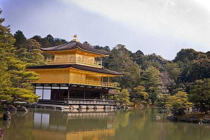 Ця споруда, вкрита листами золота. Павільйон спорудив Есиміцю в 1397 році, коли втомився від правління. Біля святилища розташоване красиве озеро та сад, який вважається одним із найкрасивіших у країні. У ньому багато доріжок, струмків та ставків. На першому поверсі павільйону приймають гостей, на другому – виставка живопису. На третьому проводять релігійні обряди.
