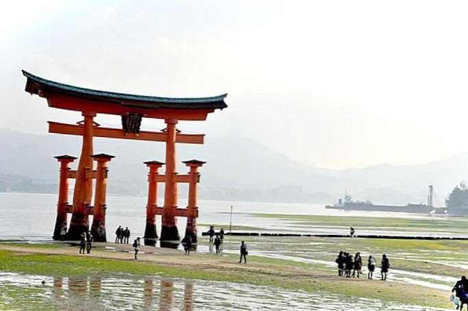 Святилище розташоване на острові Міядзіма. Ворота торії, що знаходяться на його території, вважаються одним із символів Японії. Вигляд на них відноситься до "Трьом знаменитим пейзажам Японії". Їхня висота 16 метрів. Побудовані вони на палях у воді. Дійти до воріт можна лише під час сильного відливу. Дійшовши до них, потрібно засунути в тріщину в дереві монетку та загадати бажання.