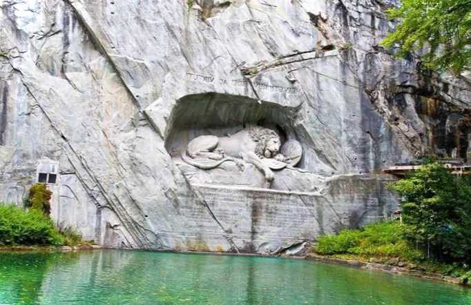 Скульптурна група, присвячена загиблим у 1792 році швейцарцям, які захищали палац Тюїльрі під час подій Великої Французької революції. Монумент був створений у 1821 році скульптором Л. Ахорном за ескізом іншого знаменитого майстра Б. Торвальдсена. Пам'ятник є висіченим у скельному виступі горельєфом, який зображує могутнього лева в останні хвилини його життя.