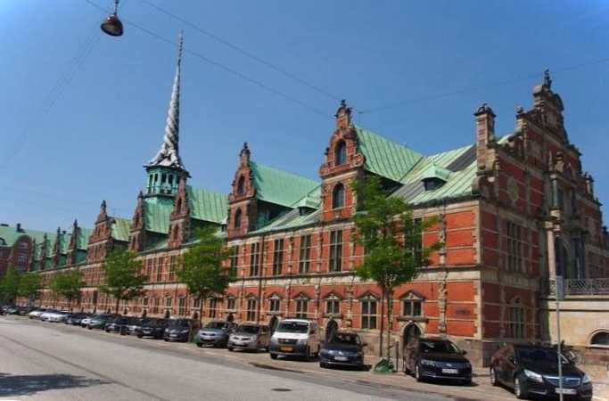 Копенгагенська фондова біржа, заснована Християном IV. Будівля збудована у стилі епохи Ренесанс. Високий 56-метровий шпиль, виконаний у формі драконячих хвостів, що сплітаються, символізує союз Норвегії, Данії та Швеції. На першому поверсі біржі розташовувався товарний склад, а на другому – торгові зали. На початку XX століття будинок зазнав штурму безробітних, але сильних руйнувань не було. У наші дні біржа використовується для проведення культурних заходів, вечерь та прийомів.