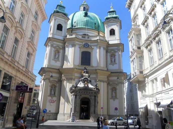 Церква Святого Петра Одна з найстаріших церков столиці, побудована за імператора Леопольда I. Купол храму був спроектований за образом куполу Собору Св. Петра у Ватикані. Згідно з деякими історичними джерелами, у 792 році тут існувала церква, закладена за Карла Великого. Перша пряма згадка про храм відноситься до XII ст. Будинок у романському стилі згорів у XVII ст., через десять років на його місці було зведено сучасну церкву Св. Петра.