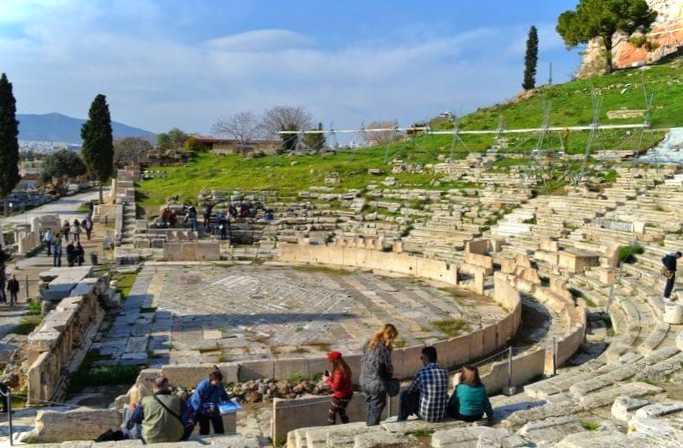Театр розташований у південно-східній частині Акрополя, він був зведений у V столітті до н.е., і є найстарішим театром Афін. На підмостках сцени ставилися твори Евріпіда, Арістофана, Софокла та Есхіла. У I столітті до н.е. за імператора Нерона було проведено масштабну реконструкцію театру. Сцена занепала до IV століття н.е. і поступово була занедбана. В наші дні здійснюється масштабний проект реставрації театру.