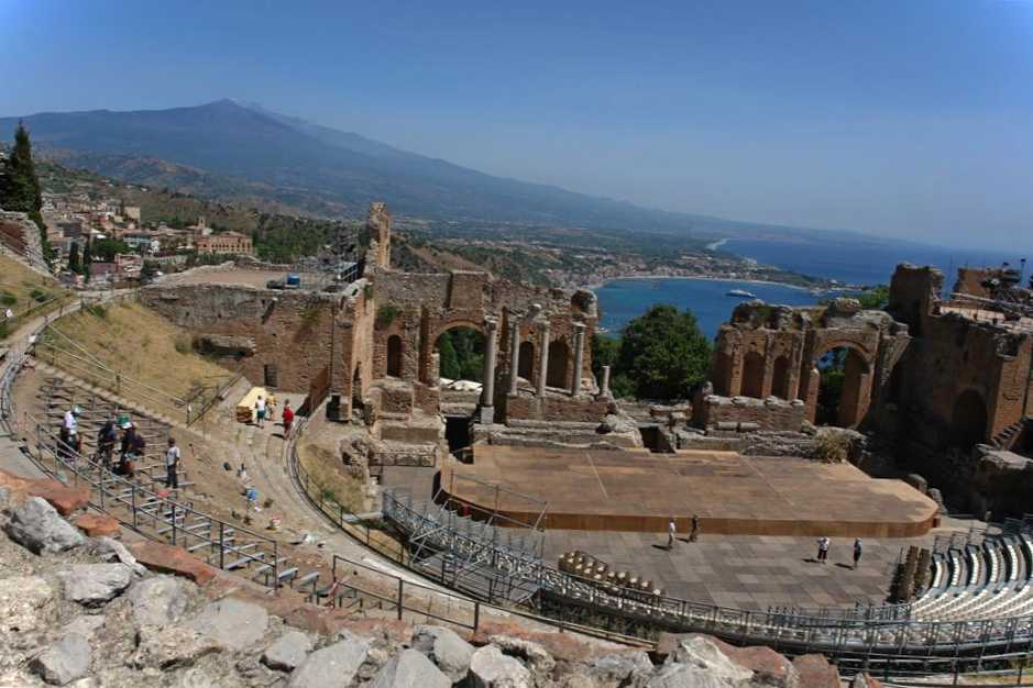Античний театр, заснований греками в ІІІ столітті до нашої ери. Знаходиться на Сицилії в місті Таорміна. Побудований на горі, для чого довелося розрівняти її верхівку та зробити поглиблення у вигляді чаші. У першому столітті нашої ери римляни перебудували театр для гладіаторських боїв. Сьогодні тут проходять фестивалі та концерти. Діаметр кавеї 109 метрів, місткість трибун – 10 000 осіб. Сидячи на верхніх ярусах, глядачі можуть насолоджуватися не лише поданням, а й видом на море, місто та вулкан, що димить.