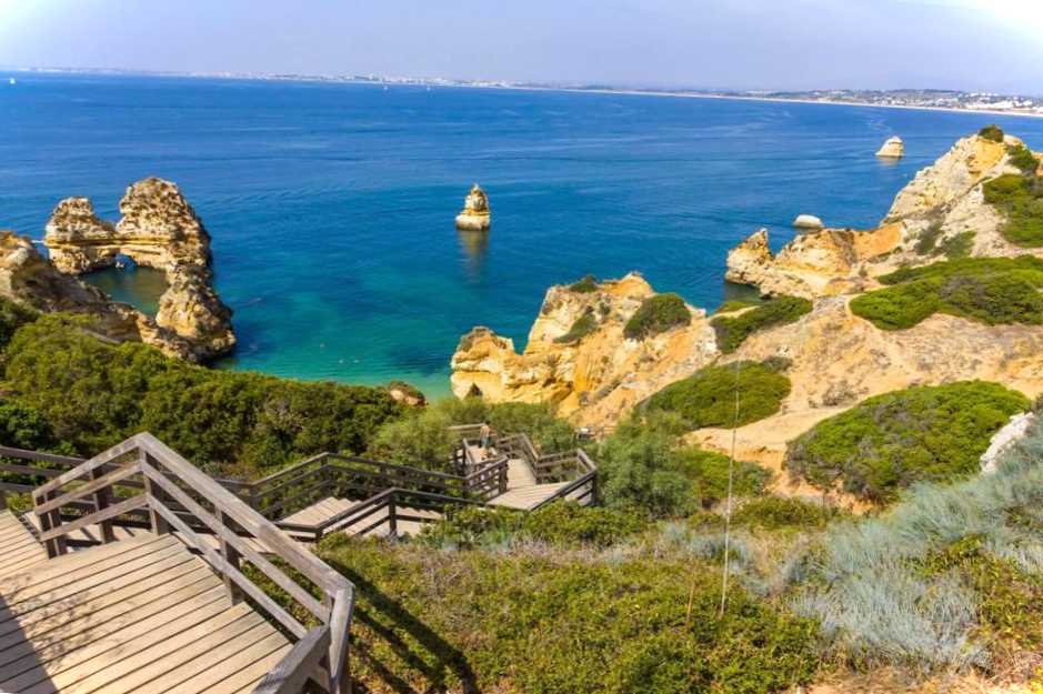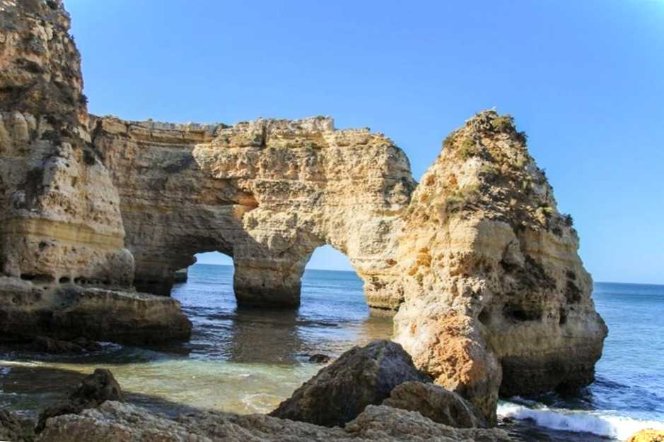 Дикий піщаний пляж, облямований вапняковими скелями. Знаходиться біля невеликого містечка Лагоа. У західній частині пляжу розташована подвійна арка, на тлі якої люблять фотографуватися туристи. З майданчика над аркою відкривається панорамний вид на узбережжя. Бухти у східній частині пляжу підходять для сноркелінгу та дайвінгу. Путівник "Мішлен" включив Марінью до десятки найкрасивіших пляжів Європи.
